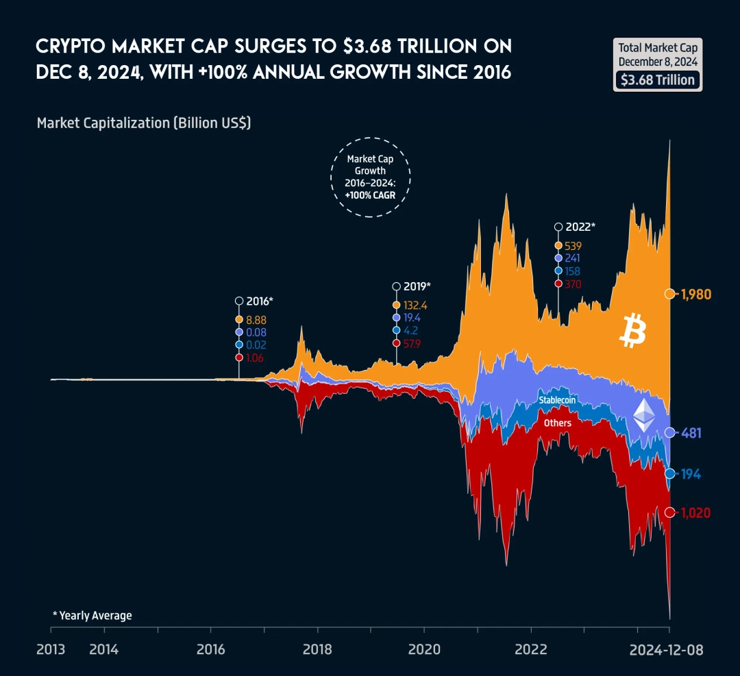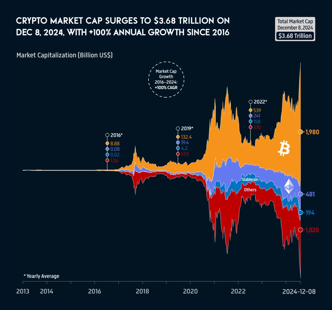 The cryptocurrency market has experienced remarkable growth, reaching a total market capitalization of $3.68 trillion in December 2024. Since 2016, the market has maintained an impressive average annual growth rate of +100%.
